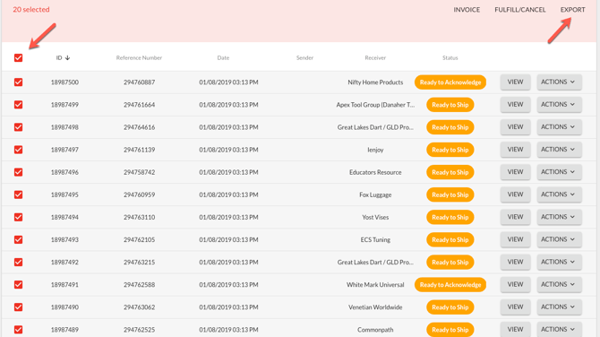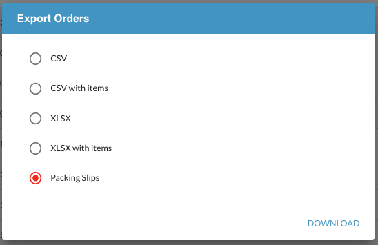 3. Click on the Export button and select the option Packing Slips. Click Download.