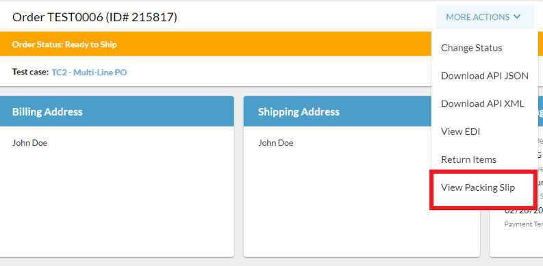 3. Go to the More Actions drop-down menu in the header of the Order Details page and choose View Packing Slip