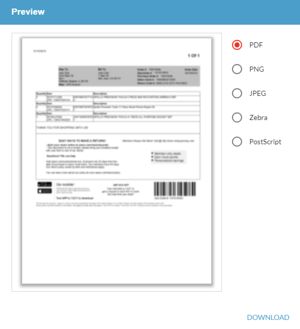 6. From there you may download the single packing slip in the following formats: PDF, PNG, JPEG, PostScript, Zebra.