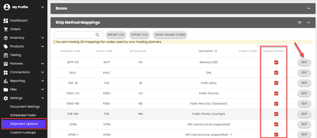 - You will see a list of all the ship methods that all your retailers accept (to see partner-specific ship methods, scroll down to Partner Ship Method Mappings).