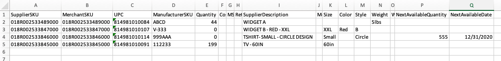 - For testing, the only required fields are SupplierSKU, MerchantSKU, Quantity, and Cost. Additional fields may be required in Production, as defined by the Retailer.